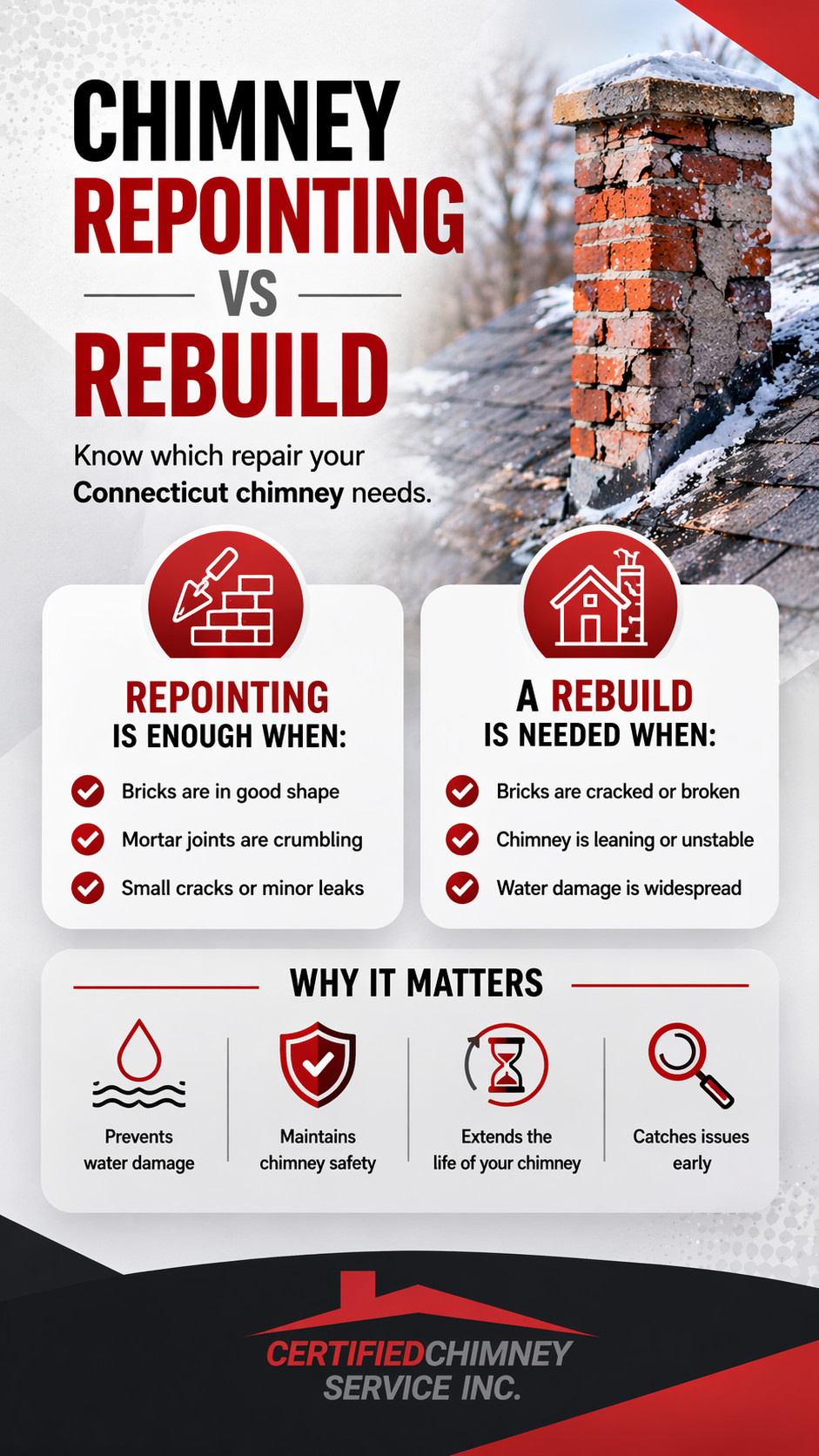 Professional chimney inspection is the best way to determine whether repointing or rebuilding is needed. Certified chimney technicians inspect mortar joints, chimney liner condition, and overall masonry stability. This helps identify hidden chimney damage that may not be visible from the ground. Video inspections and structural assessments provide accurate repair recommendations. Homeowners can schedule a professional chimney inspection in Connecticut to evaluate chimney condition and prevent serious problems. Regular inspections protect your home, improve chimney safety, and ensure your chimney system lasts for decades.