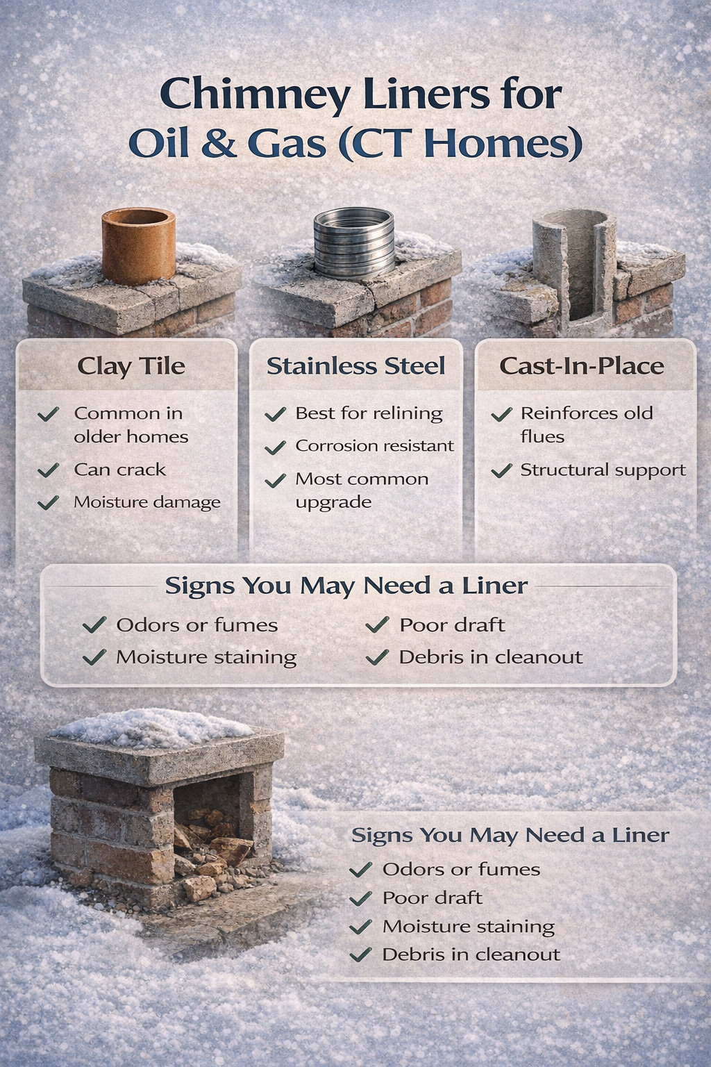 A modern oil flue liner or stainless steel chimney liner can help protect the chimney system and improve long-term reliability, especially during CT’s long heating season.