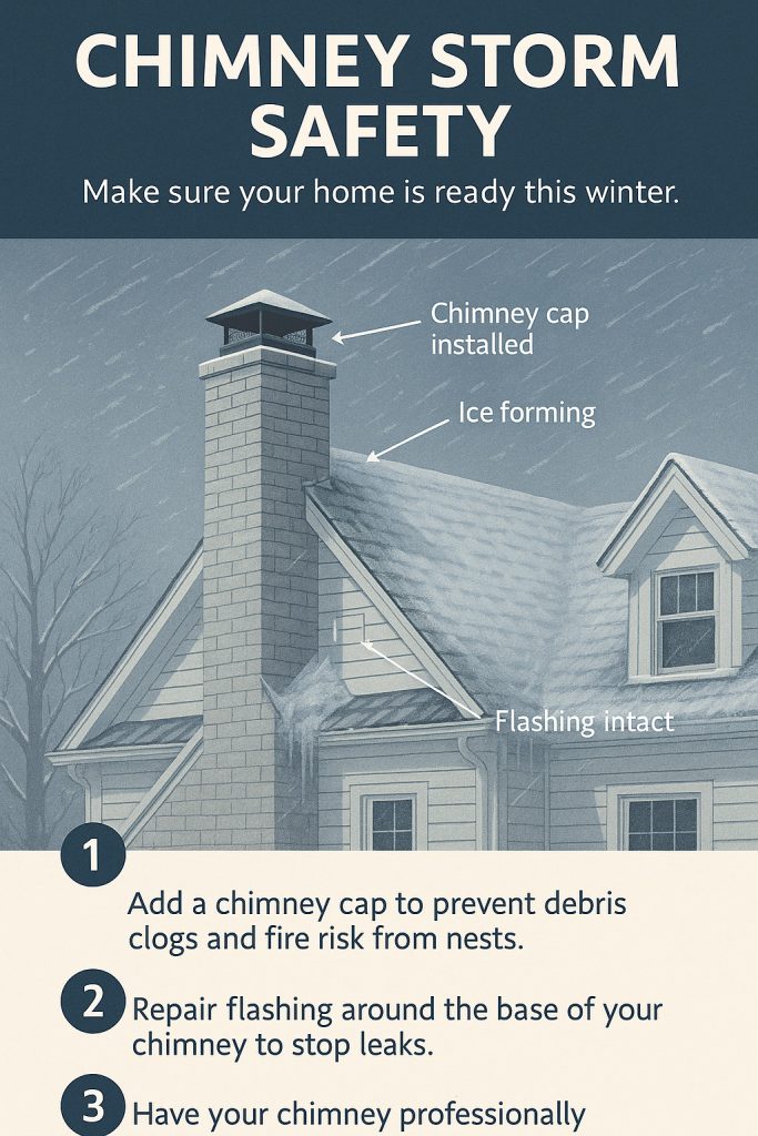 Flashing that is loose, torn, or lifting can allow water penetration during storms. Storm windows and attic insulation can help maintain indoor warmth, but the chimney’s exterior seal is what protects your attic ventilation and roof decking from moisture. Repairing flashing before a storm limits future structural problems.