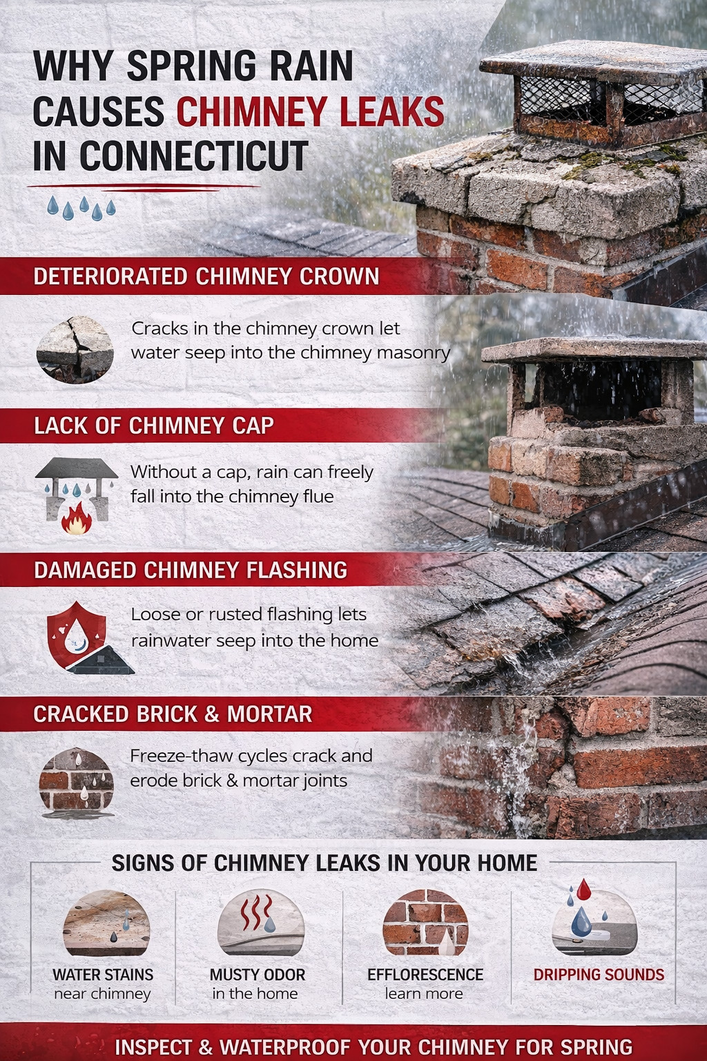 Spring rain in Connecticut often exposes hidden chimney leaks that formed during winter freeze thaw cycles. Snow and ice soak into brick and mortar, then expand and crack masonry as temperatures change. This allows water infiltration when heavy rain arrives in spring. Over time, moisture travels through mortar joints and chimney flue walls, causing water damage and structural problems. Homeowners may notice water stains, musty odors, or efflorescence removal issues inside the home. These signs indicate the chimney system is no longer water resistant. Preventive chimney inspection and waterproofing services help stop leaks early and protect masonry from further deterioration.