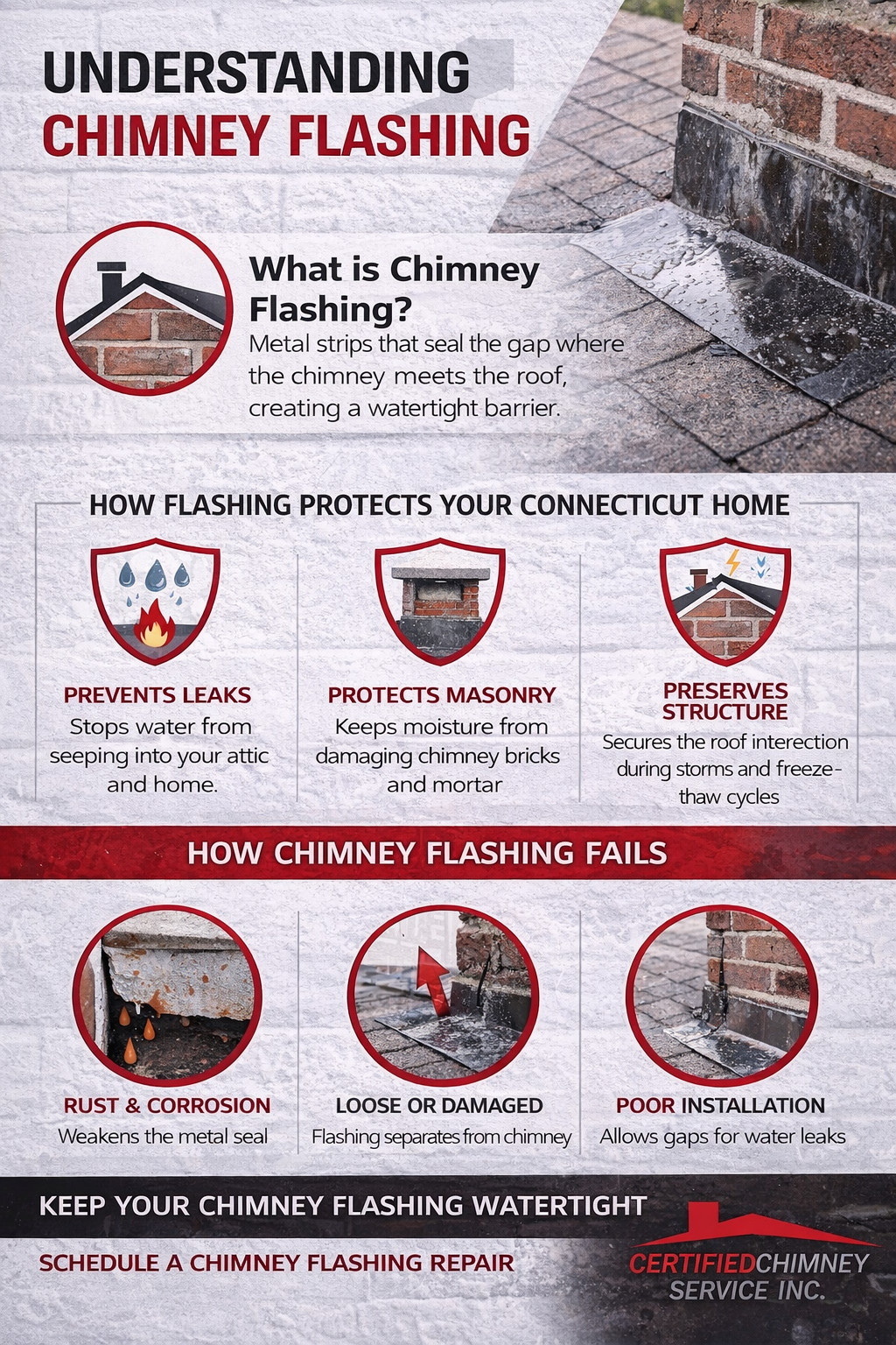 When preparing a home for sale in Connecticut, many homeowners focus on interior upgrades but overlook chimney flashing at the roofline. Flashing, usually aluminum, copper, or galvanized steel, seals the space where the chimney meets the roofing system and creates a watertight barrier. Without it, rain, heavy snow, and wind can force moisture into the roof deck and chimney masonry, leading to water damage, warped flashing, and deteriorating mortar joints. In Connecticut’s freeze-thaw climate, maintaining proper flashing is essential for protecting the fireplace system and ensuring chimney safety.
