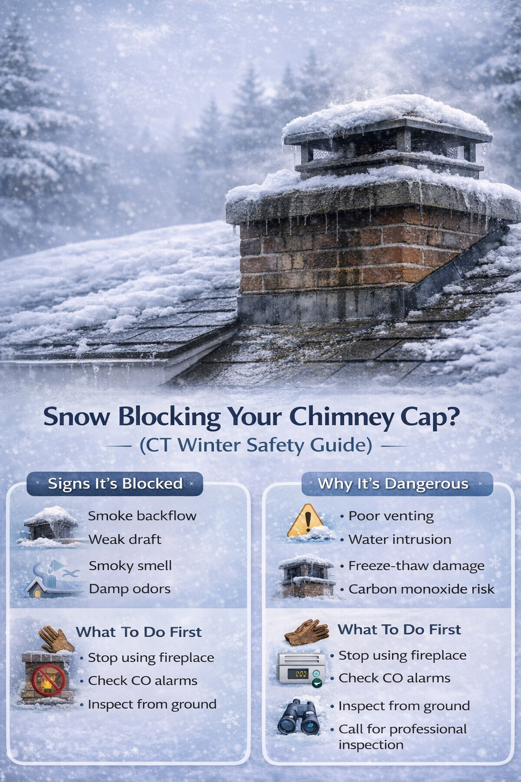 A chimney cap seems like a small piece of metal, but it protects your whole chimney system. When snow blocks it, you can get smoke backflow, moisture issues, and potential carbon monoxide risks. And when moisture gets into masonry chimneys in Connecticut, the freeze-thaw cycle does what it always does: it turns small cracks into expensive repairs.