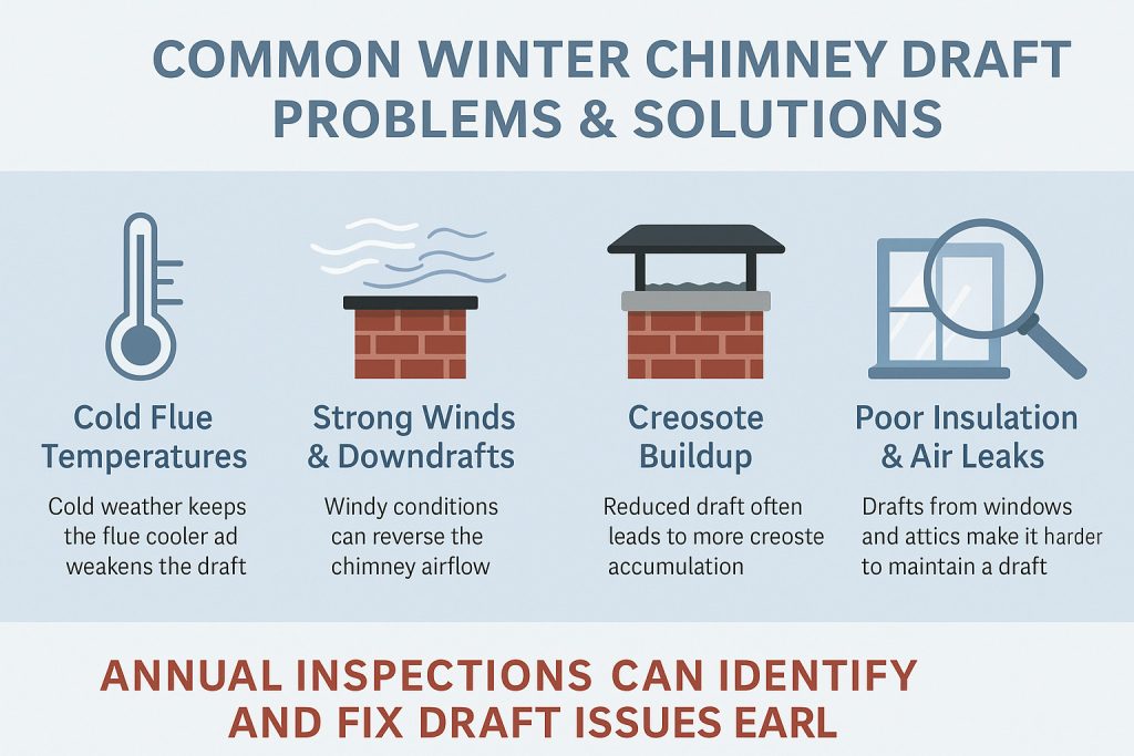 It’s the middle of January, the temperature has dipped below freezing, and you’re ready to enjoy a cozy fire. But instead of smoke drifting harmlessly up the chimney, it creeps back into your living room. For many homeowners across Nassau County, Suffolk, and Fairfield, this scenario is all too familiar. Cold weather magnifies draft problems in both chimneys and homes, creating not only discomfort but also potential safety hazards.