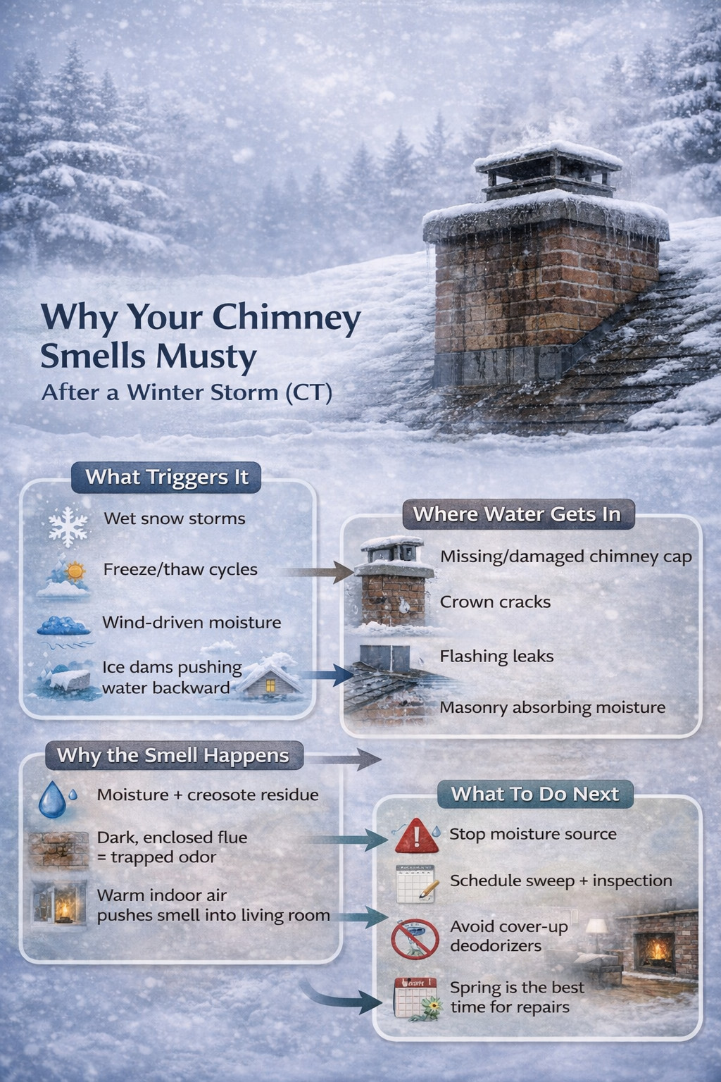 If your chimney smells musty after a winter storm in Connecticut, the best move is to get it inspected, cleaned, and sealed properly, before the next storm hits.
